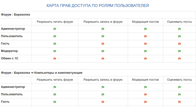 Карта прав доступа по ролям представляет собой матрицу из разделов форума и ролей пользователей.