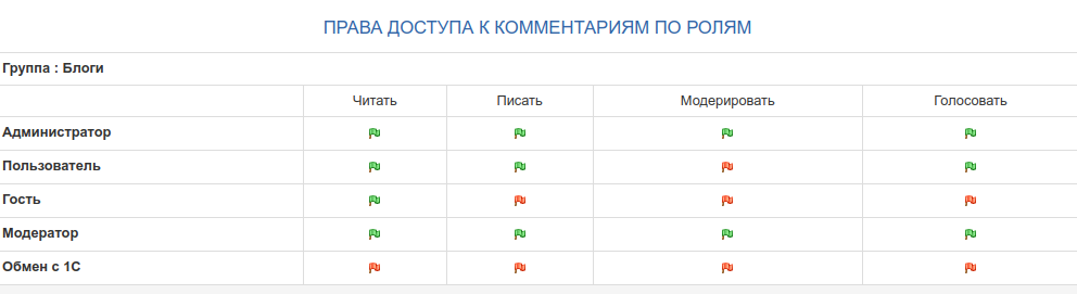 Карта прав доступа по ролям представляет собой матрицу из групп комментариев и ролей пользователей.