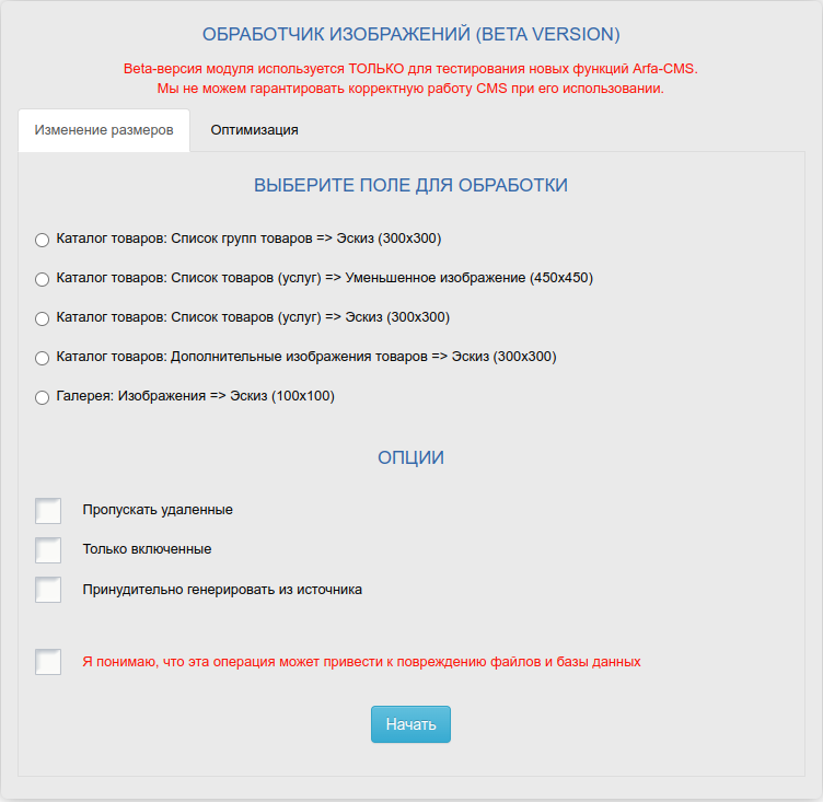 Позволяет привести все изображения указанных модулей к стандартным размерам, указанным в настройках этих модулей. Beta-версия модуля используется ТОЛЬКО для тестирования новых функций Arfa-CMS.