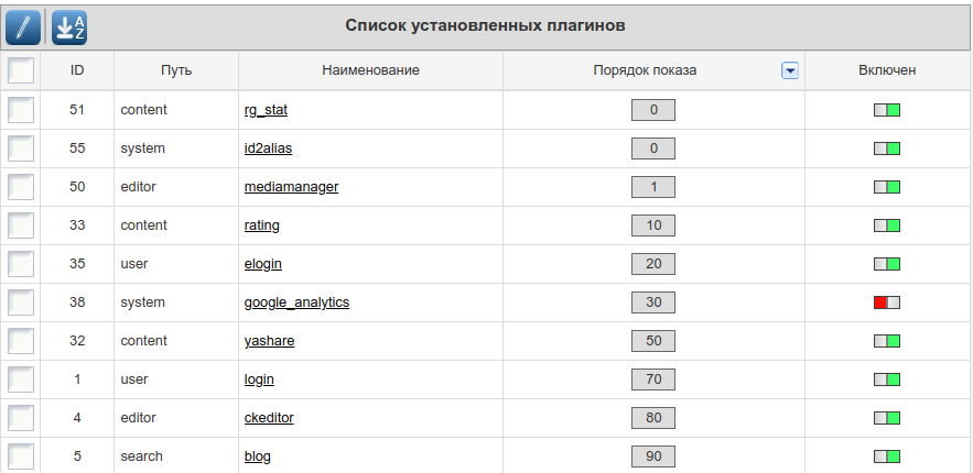 Плагины можно оперативно включать и выключать посредством переключателя в колонке "Включен".