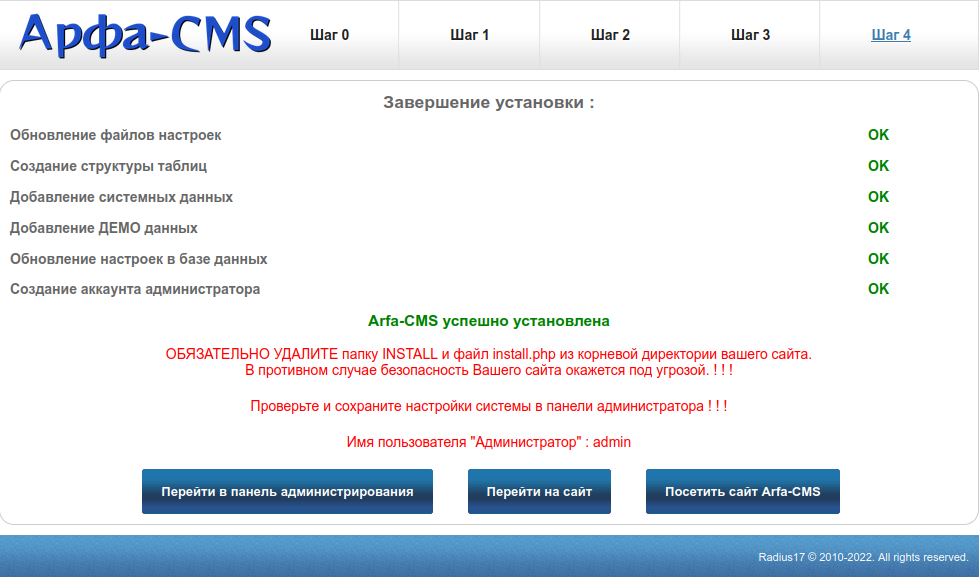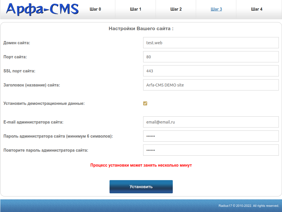 Установить демонстрационные данные: Если Вы отметите этот флажок, то сайт будет заполнен данными для демонстрации возможностей системы.