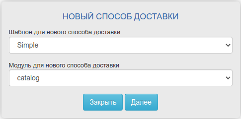 Новый способ доставки создается в 2 шага. Сначала выбирается шаблон и модуль для нового способа доставки и происходит его сохранение,