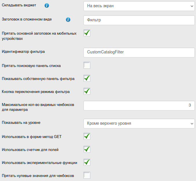 В дополнение к общим для всех виджетов, имеет следующие настройки: